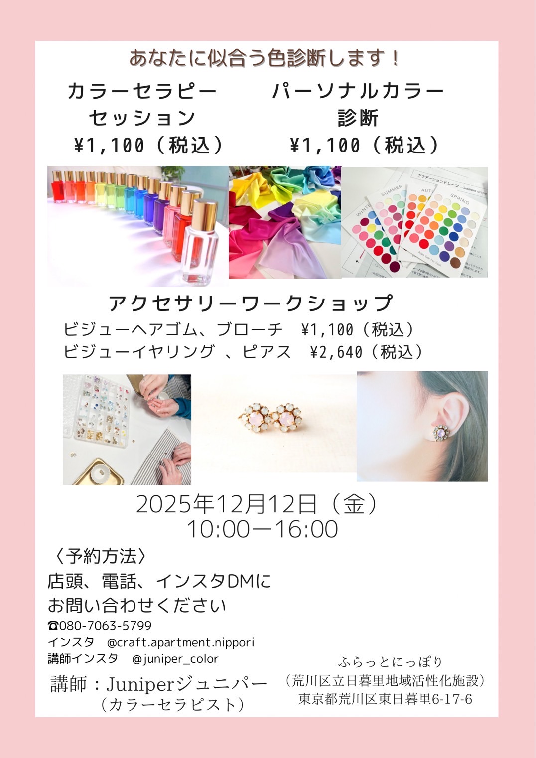12/12(金)似合う色の診断やカラーアクセサリー作り(ヘアゴム、ブローチ、イヤリング、ピアス)