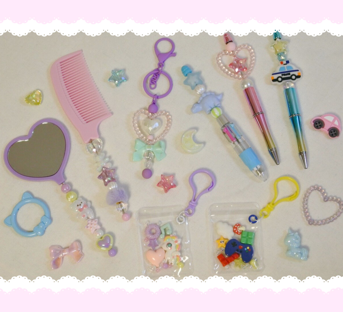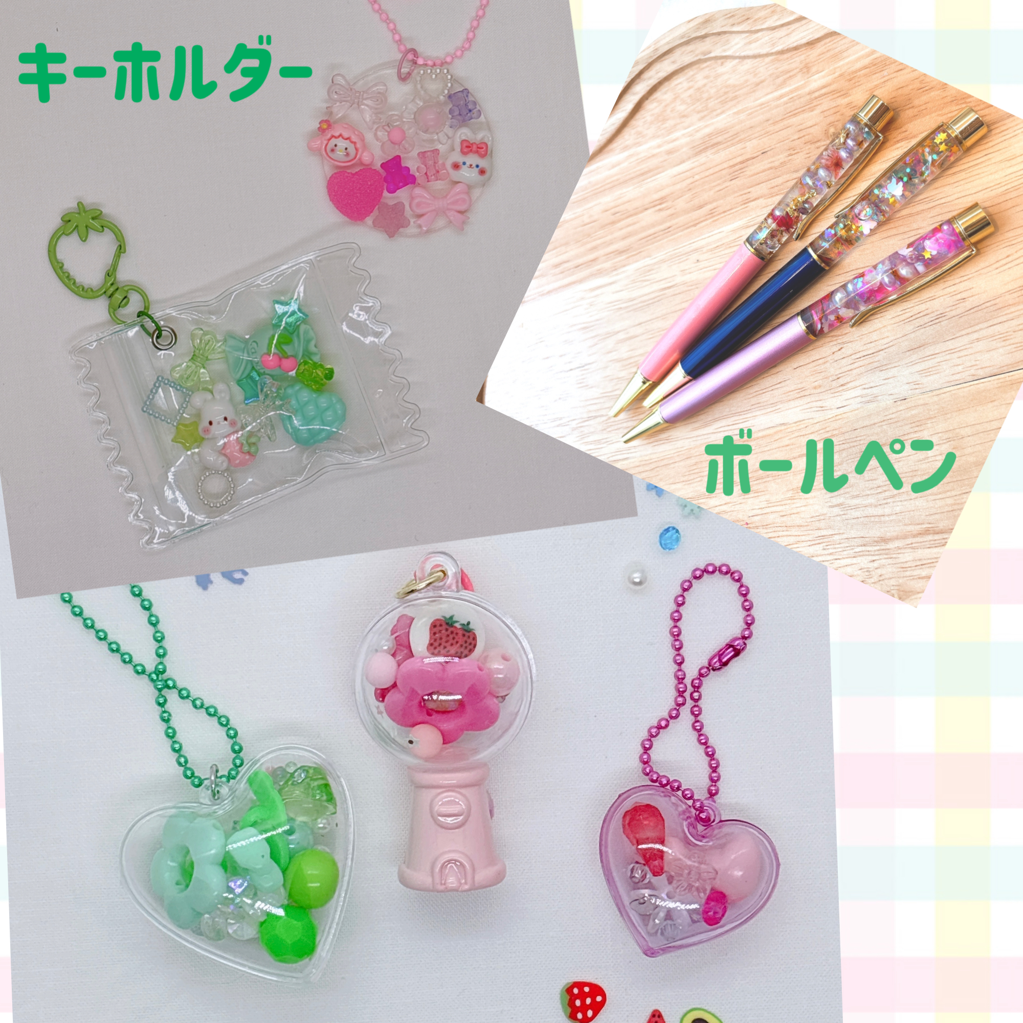 ビーズやお花等の好きなパーツを使う、①ボールペンや②キーホルダー作り