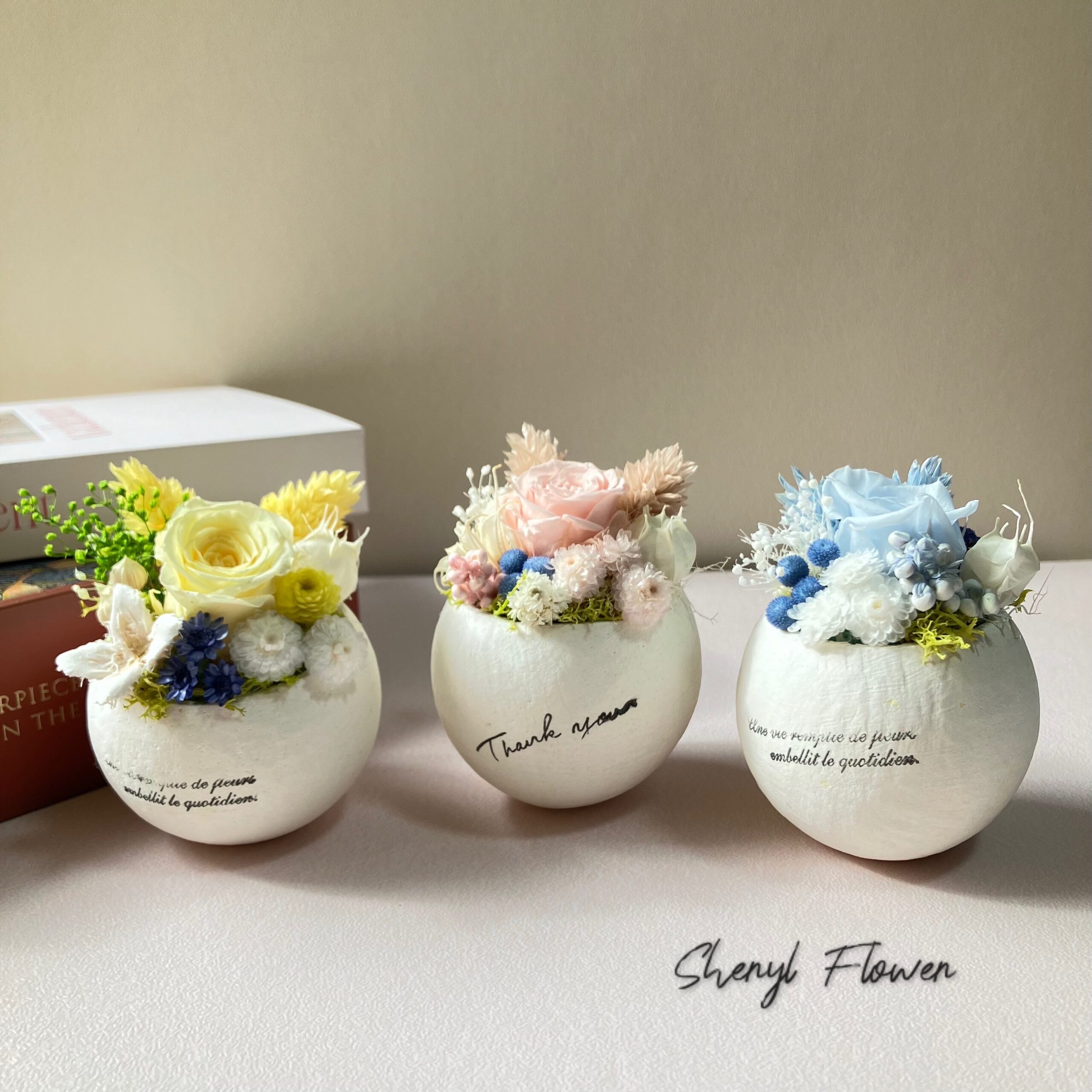 丸いベルカップ (果実の実)にプリザーブドフラワーの薔薇を中心に小花を散りばめたベルカップフラワーアレンジ。