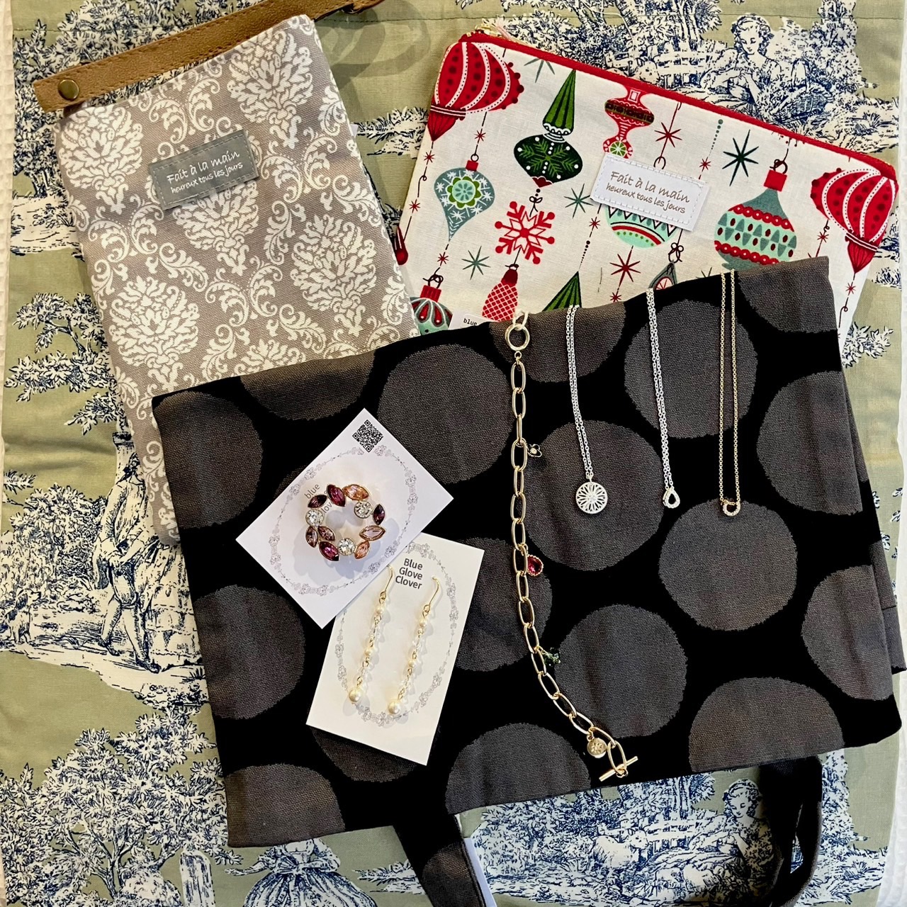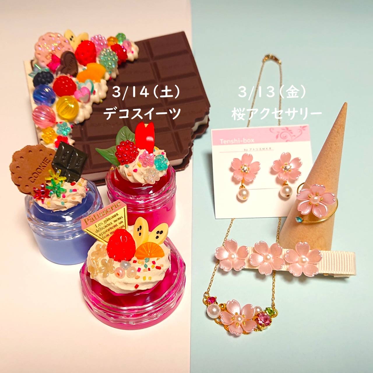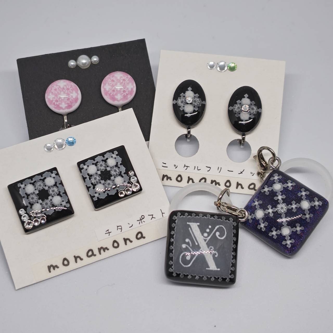 オリジナルイラストのプラ板レジンアクセサリーと紙雑貨、ビジューアクセサリー等