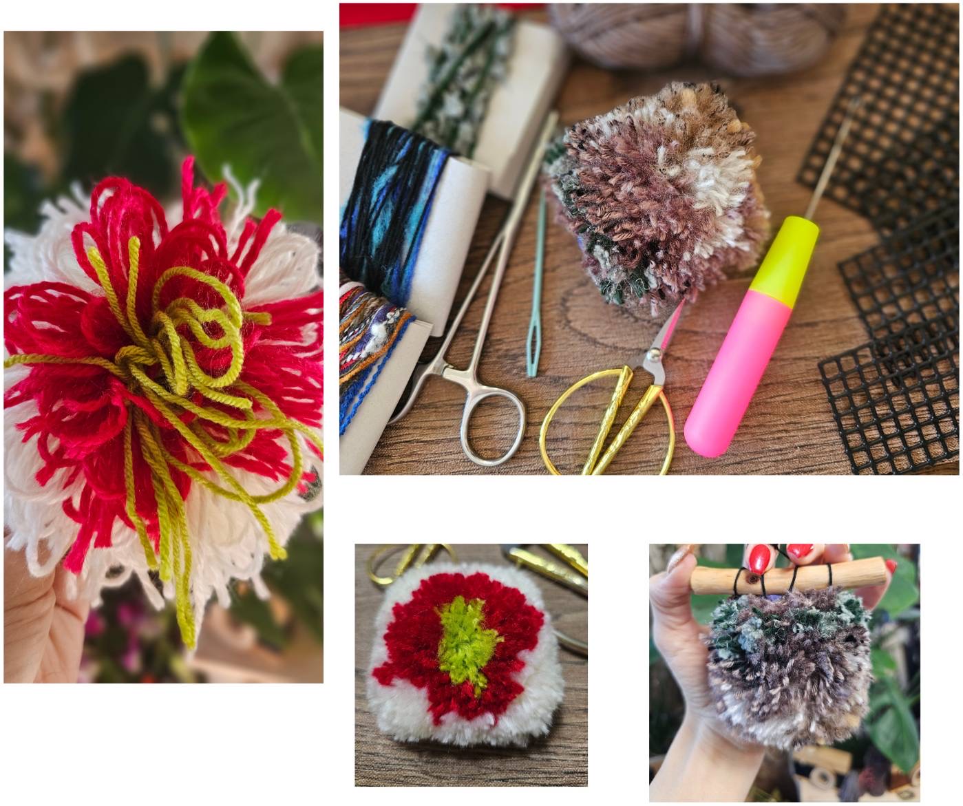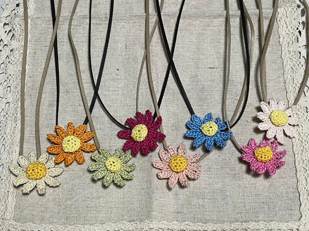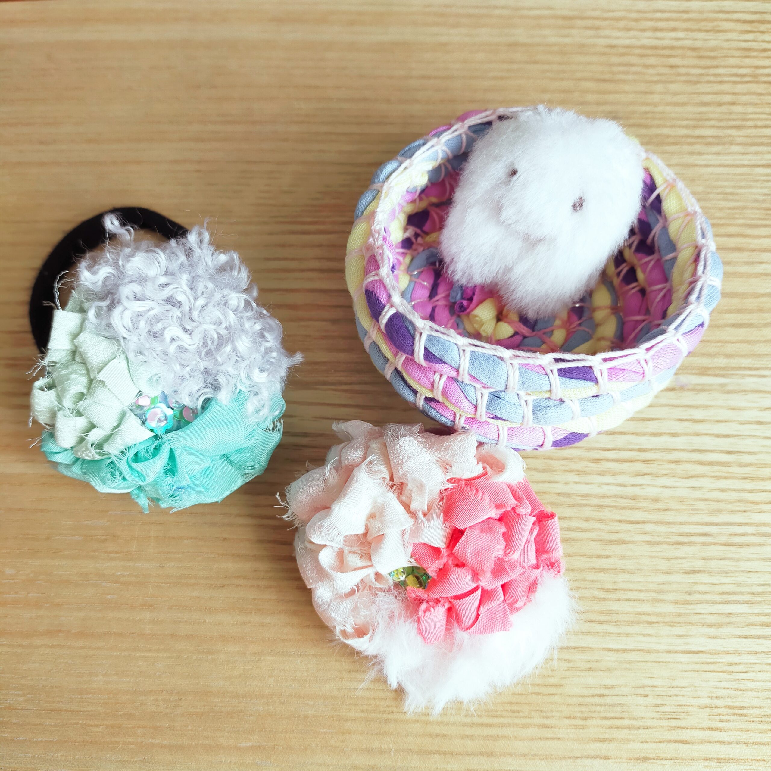 簡単かわいいふわもこお花のモチーフを使ったブローチ、ヘアゴム、キーホルダー製作とかぎ針で編むミニモロッコカゴ。