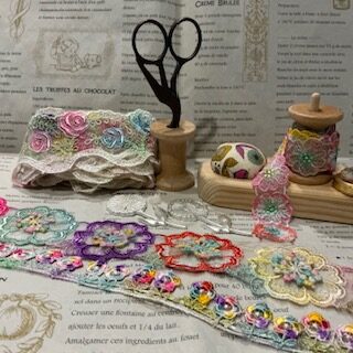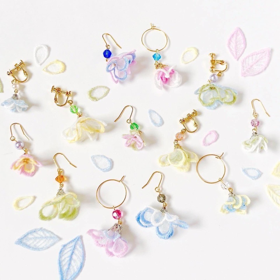 オリジナルの刺繍レース生地に手刺繍をプラスしてアクセサリーをつくるワークショップです。 初心者さんでも安心、簡単なステッチだけで完成します。お好みのレースの色、ビーズの組み合わせておつくりいただけます。