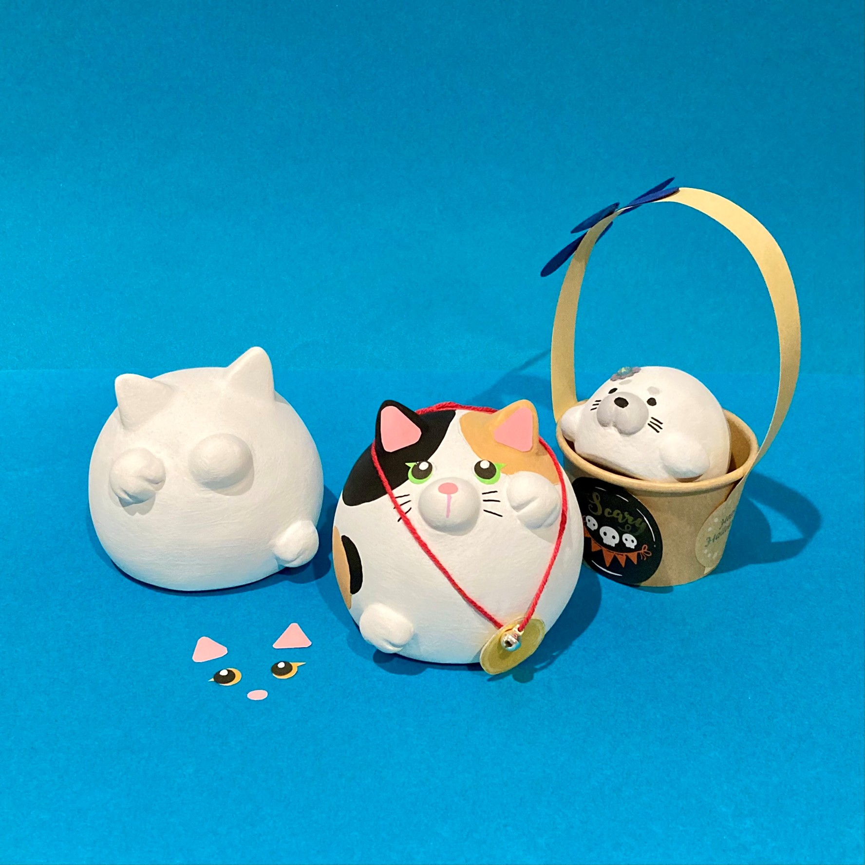 真っ白な張り子ネコとあざらしに色を塗って、ステキなインテリアに。
