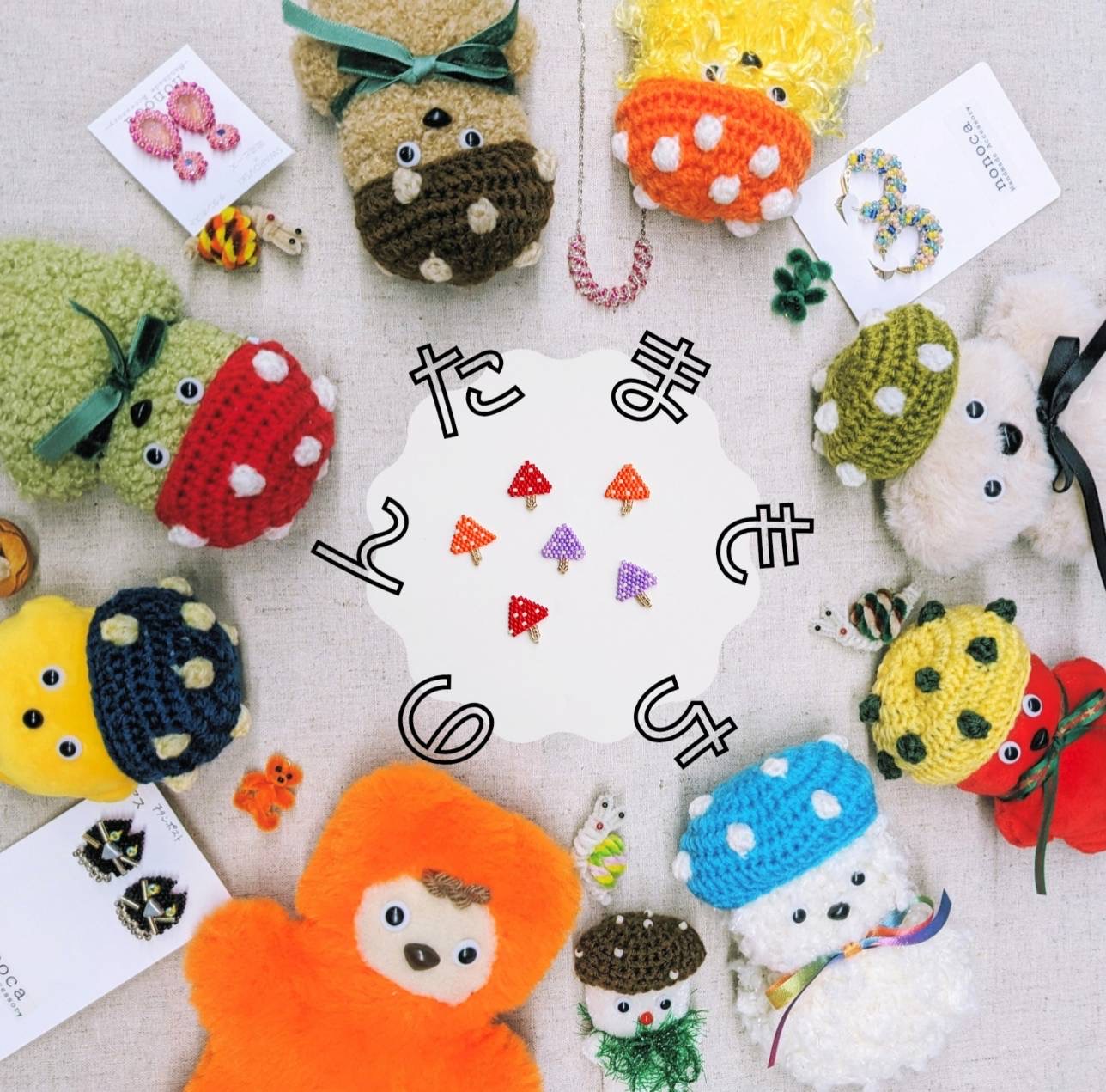 ぬいぐるみ、編み小物、ビーズ小物など3人の作家による作品を販売します