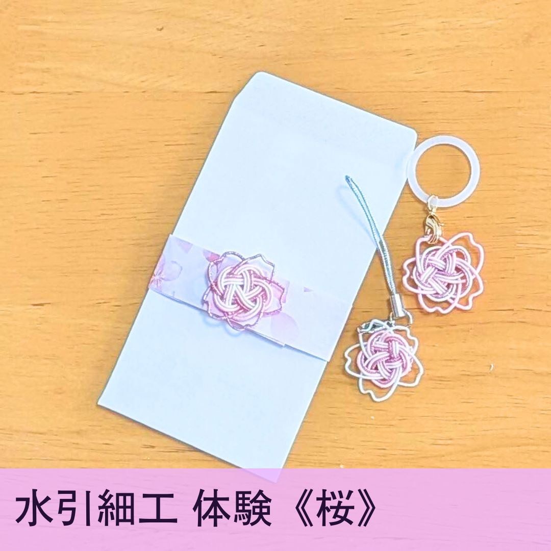 水引の基本技法「梅結び」を用いて、桜をイメージしたモチーフを制作します。完成した桜は、和紙と千代紙を使ってミニ祝儀袋に仕立てます。小さめサイズでギフトカードにもピッタリです。